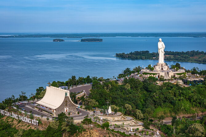 Sau đó đoàn khởi hành đến trung tâm Hành hương Đức Mẹ Núi Cúi - giáo phận Xuân Lộc tọa lạc tại xã Gia Tân 1, huyện Thống Nhất, tỉnh Đồng Nai, được khởi công xây dựng vào ngày 18.09.2015, hiện có tổng diện tích gần 100 hecta, nằm trên một ngọn núi cao 176m cạnh lòng hồ Trị An. Tại đây quý khách có thể ngắm toàn cảnh Hồ Trị An.