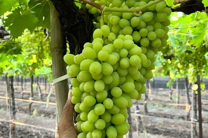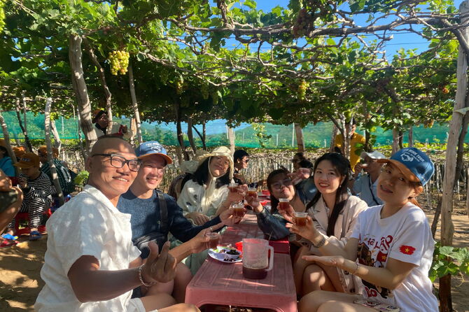 Đoàn đến Phan Rang: Thưởng thức đặc sản mật nho, rượu nho, mủ trôm, tỏi Phan Rang miễn phí. Quý khách tham quan Vườn Nho và thoải mái chụp hình bên những chùm nho nặng trĩu (tại trạm dừng chân mua sắm).